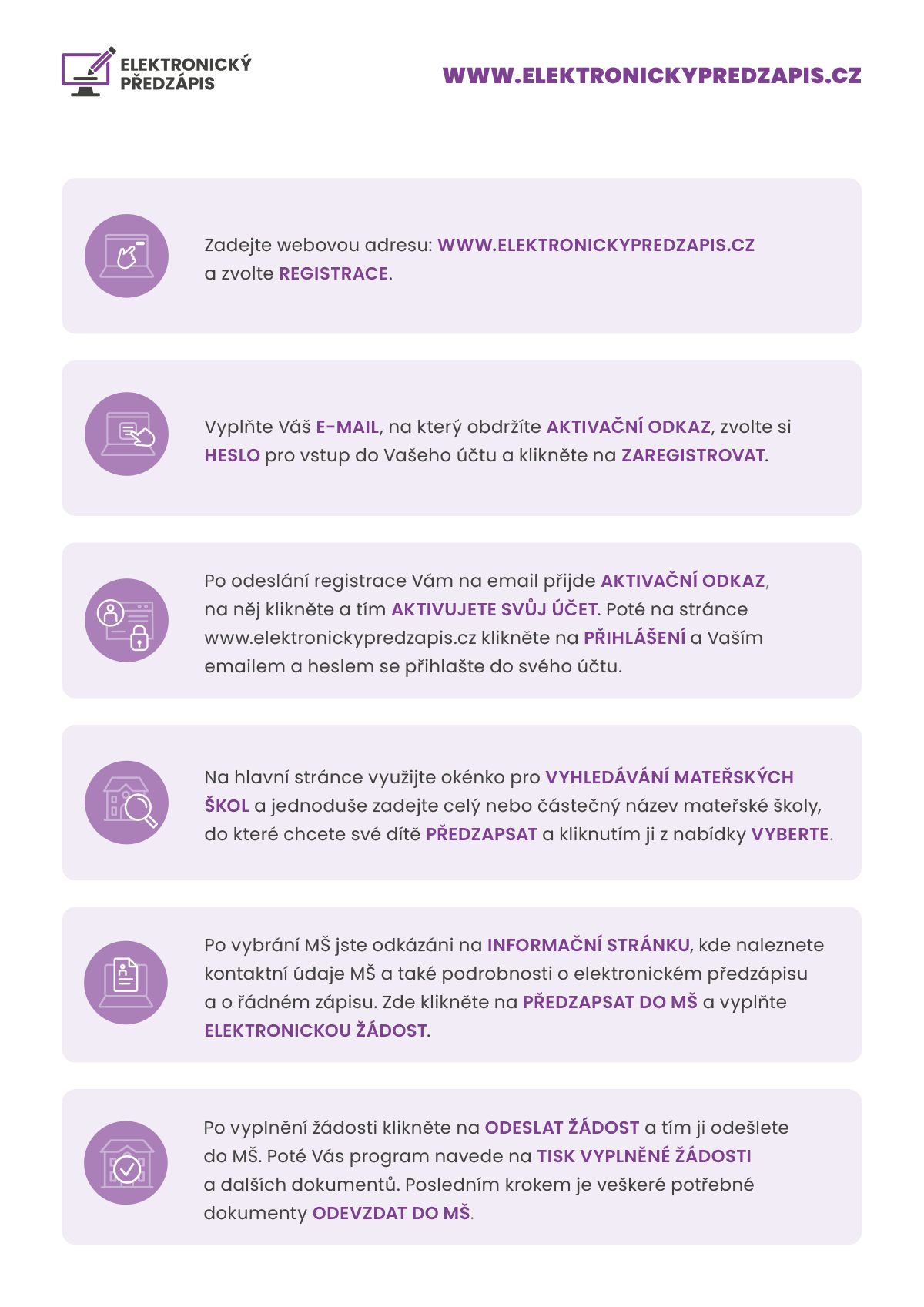 pro usnadnění a urychlení zápisu Vašeho dítěte do naší mateřské školy můžete využít Elektronického předzápisu. Na webu: www.elektronickypredzapis.cz stačí vyhledat naší mateřskou školu, zaregistrovat se a předzapsat se do ní. Je také možno využít přímý odkaz na informační stránku naší mateřské školy: